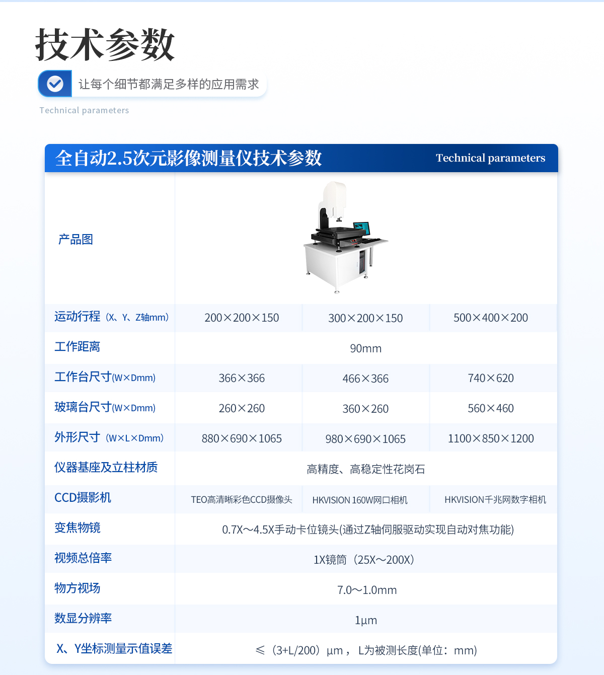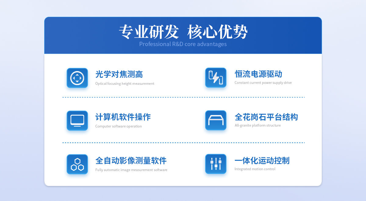 | 儀器基座 高穩(wěn)定性高精度花崗石材質(zhì) 1套 | CCD 700TVL CMOST 高清彩色CCD 1個 | 鏡頭 0.7~4.5 X手動卡位鏡頭(萊斯) 1個 | 光柵尺 高精度位移傳感電子尺,分辨率:1μm (精微) 2條 | 導(dǎo)軌 咸陽藍博P級精密V型導(dǎo)軌(LB) 3組 | 傳動 西德無牙光桿精密傳動(西德)、高精密T型絲桿(特制) 3條 | 表面光源 LED恒流環(huán)形冷光源 1個 | 底光源 綠色單顆LED冷光源+雙組透鏡均光平行底光模組 1PCS | 數(shù)據(jù)采集卡 UWC3200 1PCS | 影像測量軟件 2.5T手動影像測量軟件 1套 | 光學(xué)校正片 2.5T 1塊 | 電壓 AC :100-240V(全電壓) 1個 |