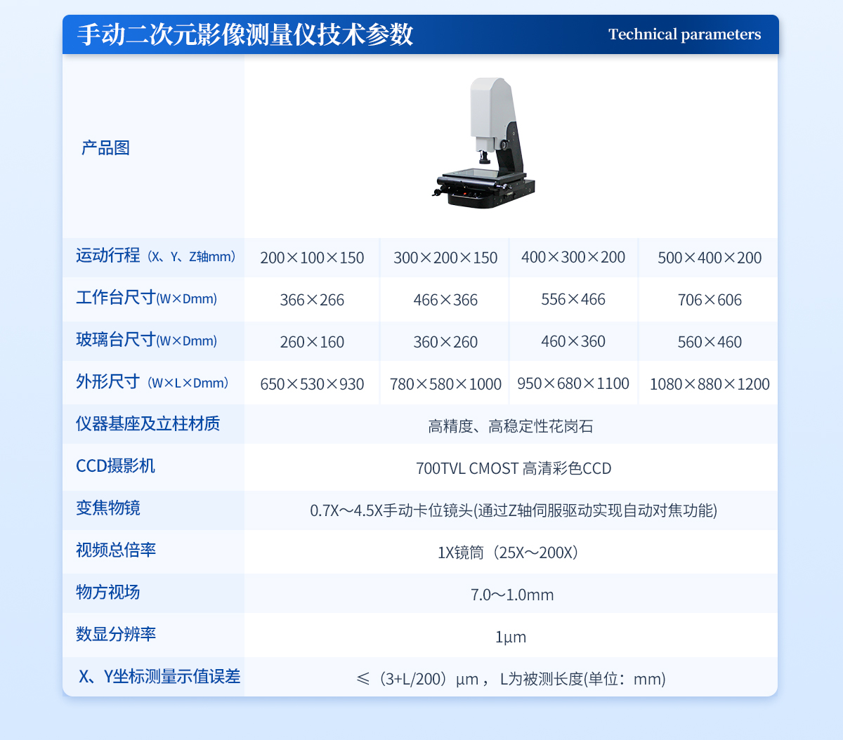 | l 運動行程(X、Y、Z軸mm):400×300×200 | l 工作臺呎寸(W×Dmm): 556×466 | l 玻璃臺呎寸(W×Dmm): 460×360 | l 外形尺寸(W×L×Dmm): 950×680×1100 | l 工作距離:90mm | l 儀器基座材質(zhì):高精度、高穩(wěn)定性花崗石 | l CCD攝影機:700TVL CMOST 高清彩色CCD | l 變焦物鏡: 0.7X~4.5X手動卡位鏡頭 | l 視頻總倍率:1X鏡筒(25X~200X) | l 物方視場: 7.0~1.0mm | l 數(shù)顯分辨率:1μm | l X、Y坐標(biāo)測量示值誤差≤(3+L/200)μm , L為被測長度(單位:mm) |