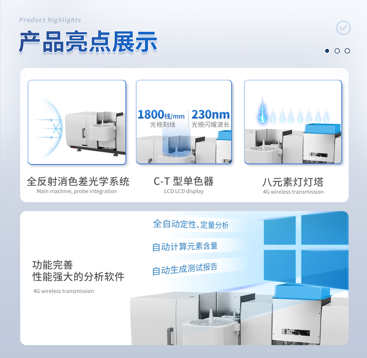 采用 1800 L/mm、閃耀波長 230nm 光柵作為分光系統。 3、八元素燈燈塔