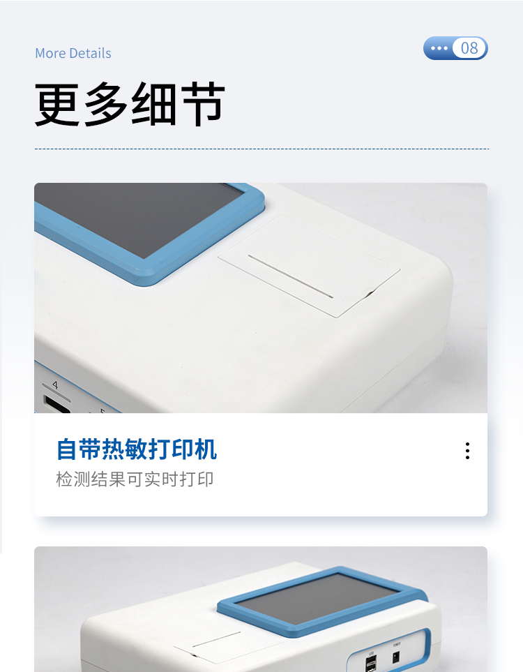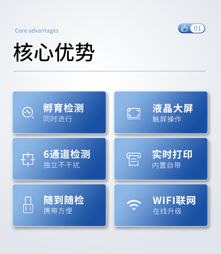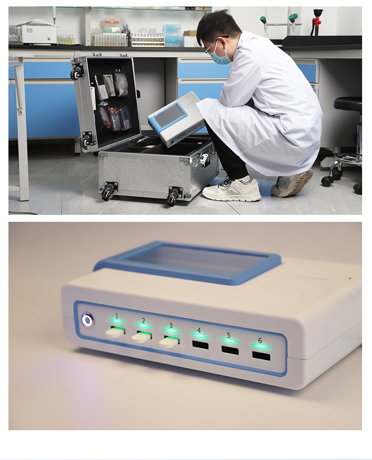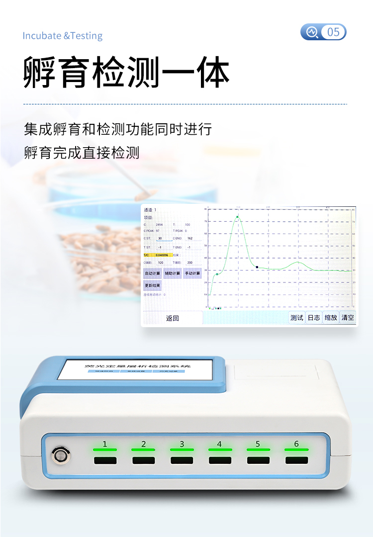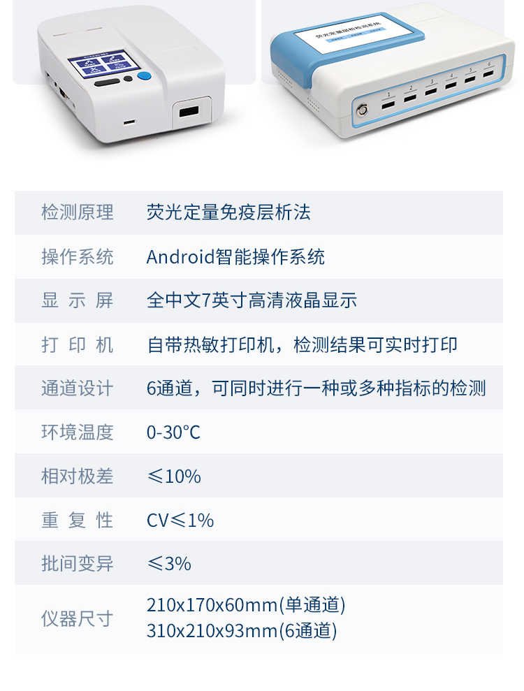 | 一體化設計,集成孵育和檢測功能同時進行,孵育完成直接檢測; | 全中文 7英寸高清液晶顯示,觸摸屏操作; | Android 系統,支持在線升級,可WIFI聯網; | 檢測原理:熒光定量免疫層析法; | 6通道設計,可同時進行一種或多種指標的檢測,6個獨立檢測單元,檢測效率高,并且互不干擾; | 具有二維碼自動識別系統,可直接識別檢測項目、檢測流程等信息; | 儀器自帶熱敏打印機,檢測結果可實時打印; | 具有檢測數據存儲(存儲數量不少于 10000 條)、查詢、批量數據處理和打印功能; | 儀器≥2 個USB 接口,可拷貝結果及原始數據,具有 wifi 接入模塊,可通過無線連接網 絡實現數據上傳; | 分鐘內達到工作狀態(37℃),封閉系統,不受外界環境(光、熱)干擾,工作環境溫度:0-30℃; | 真菌毒素和重金屬可同時進行前處理,并同時上機檢測; | 儀器配備全套前處理設備,拉桿箱設計,即可用于實驗室檢測可以外出攜帶檢測 | 相對極差≤10%; | 重復性 CV≤1%; | 批間變異≤3%; | 尺寸310x210x93mm |