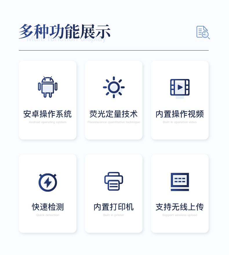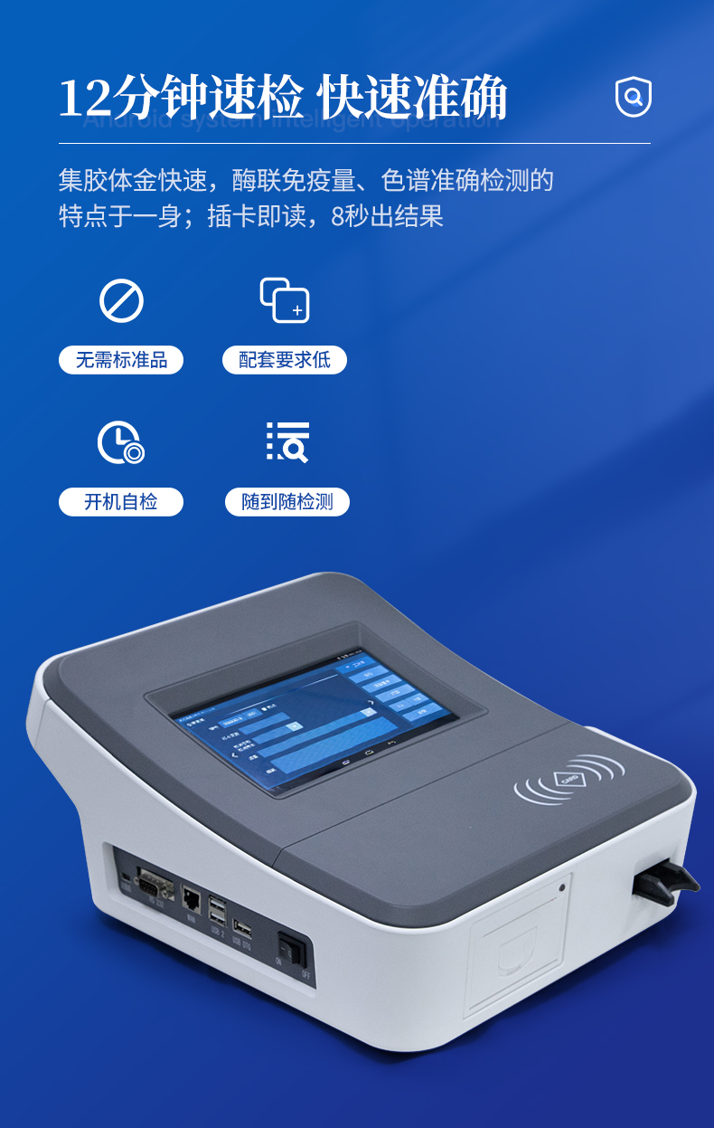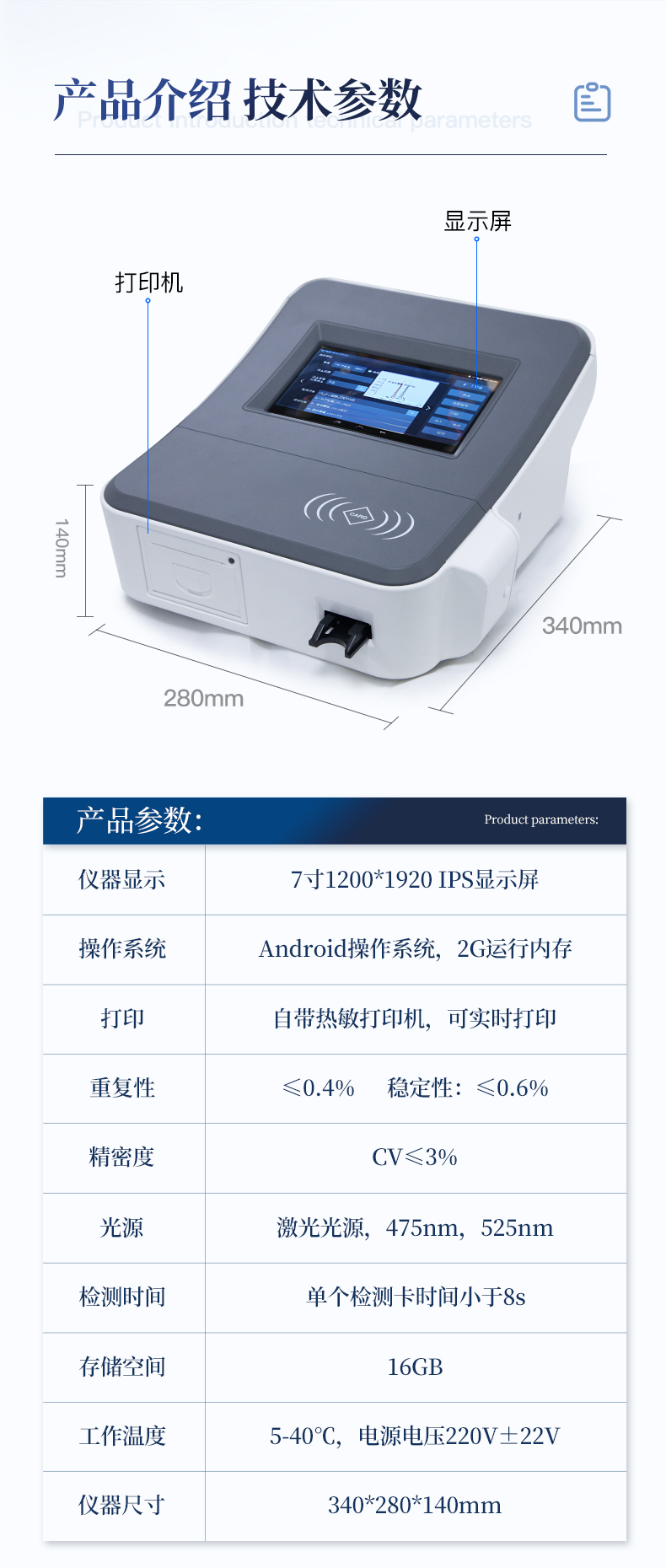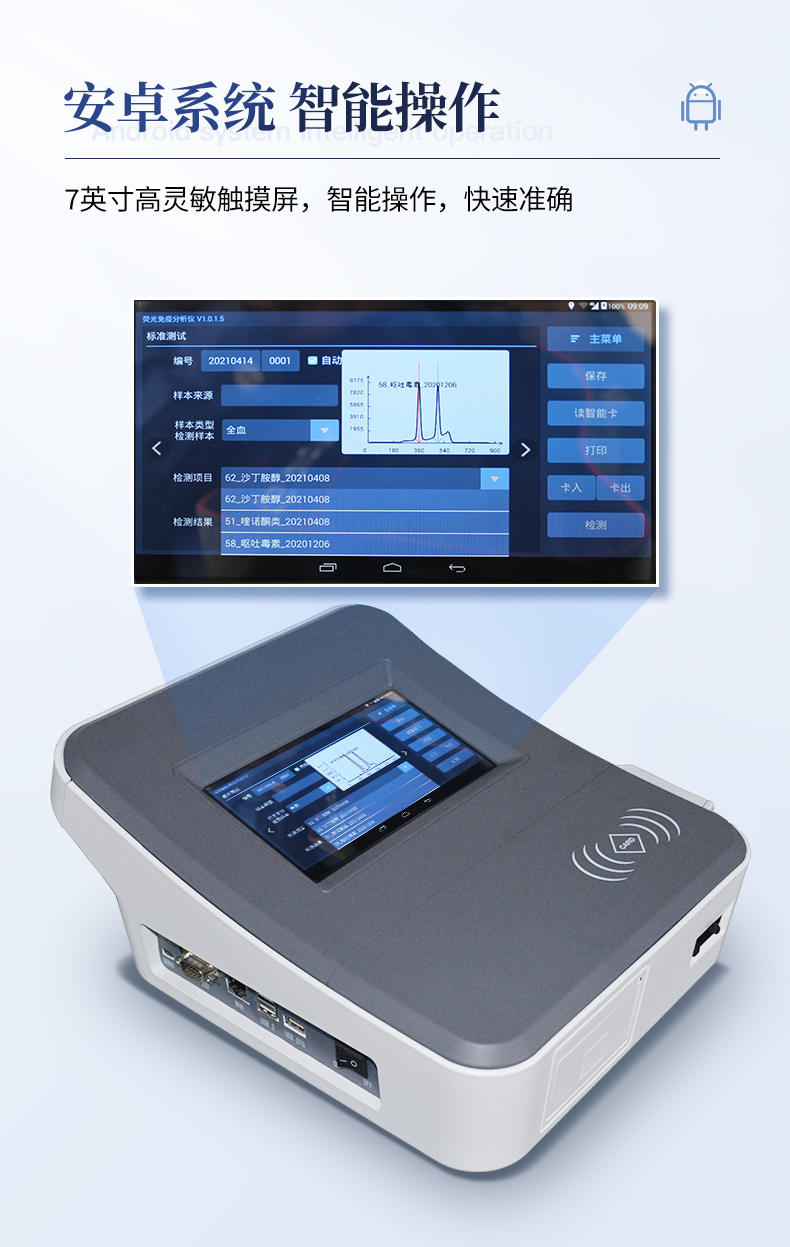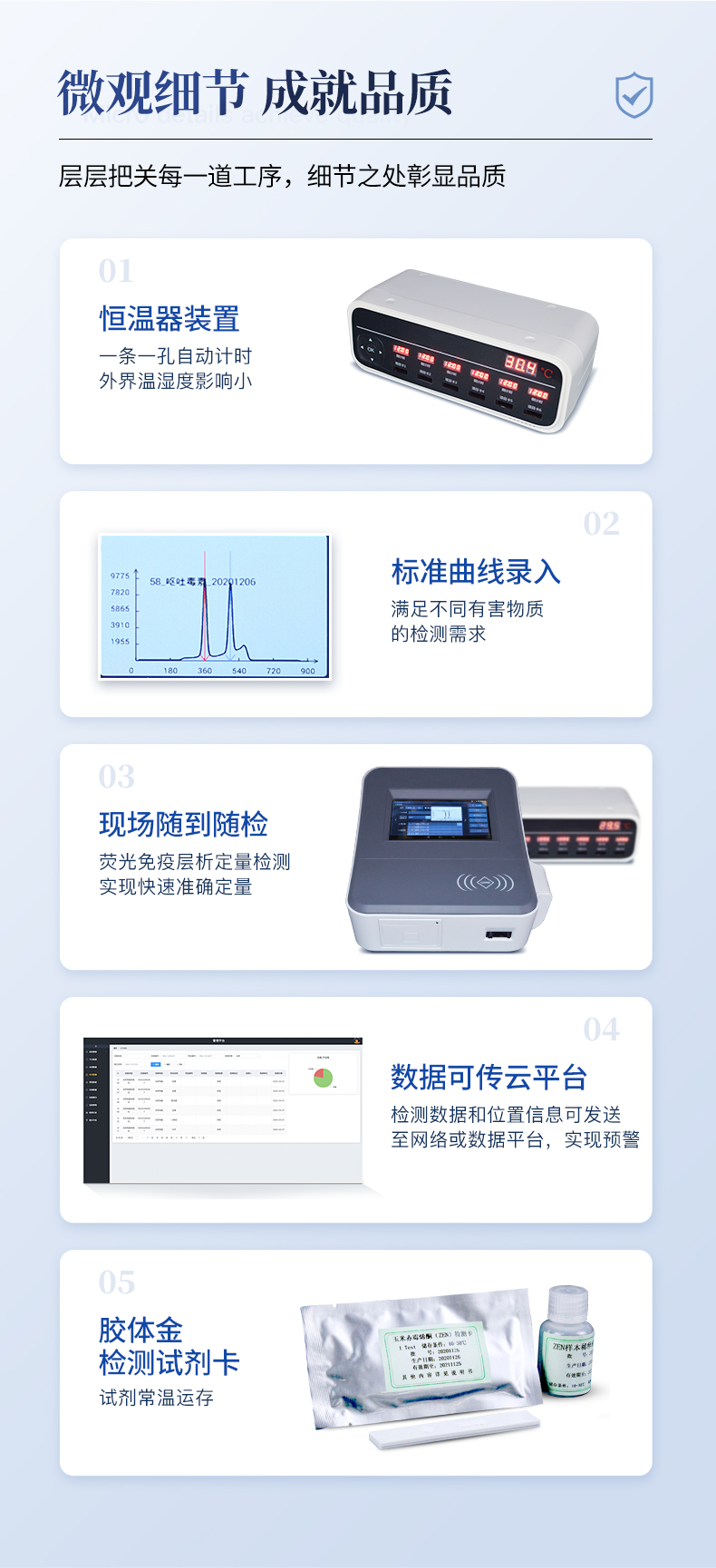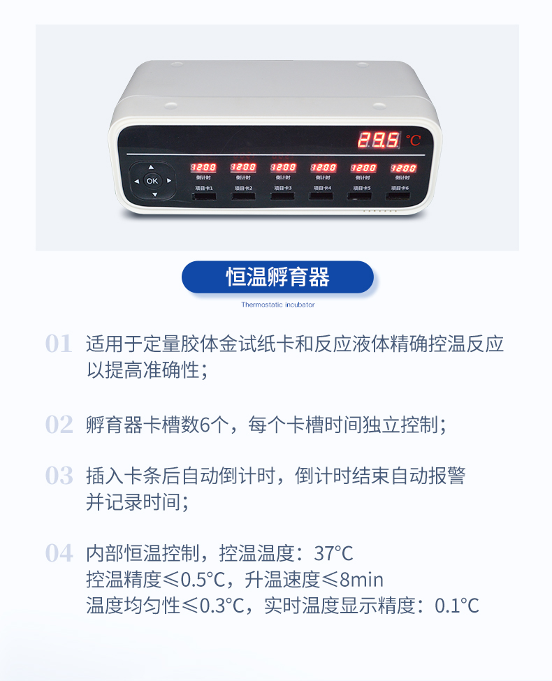| 1、儀器自動識別檢測卡條形碼上的檢測項目、樣本類型、檢測限、標準曲線,形成完整的檢測數(shù)據(jù)信息鏈。一卡一控,插卡后儀器自動讀取檢測卡顯示的C、T線的熒光信號,依據(jù)檢測卡內(nèi)置的標準曲線,自動計算結(jié)果;用戶可根據(jù)自身需求,選擇設(shè)定檢測限/定量限(內(nèi)控或國家標準限量)。 | 2、檢測數(shù)據(jù)信息采集項目(包括但不限于):儀器至少支持以下檢測數(shù)據(jù)采集:①檢測項目;②樣本類型;③檢測樣本;④國家限量;⑤檢測者;⑥檢測單位;⑦檢測時間;⑧檢測線/定量限;⑨檢測編號;⑩內(nèi)控限量 樣本來源等,并支持數(shù)據(jù)采集項目遠程擴展升級。 | 3、檢測數(shù)據(jù)采集方式:檢測數(shù)據(jù)信息采集項目中載明的:①-⑨項為儀器自動識別采集,⑩項為手寫輸入。 | 4、檢測數(shù)據(jù)上傳方式:完成檢測后,儀器能自動將檢測數(shù)據(jù)信息采集項目載明的全部檢測數(shù)據(jù)信息上傳至檢測監(jiān)管系統(tǒng)平臺。 | 5、接口:藍牙通訊接口;內(nèi)置無線WIFI,檢測數(shù)據(jù)實時傳輸?shù)綌?shù)據(jù)監(jiān)管平臺,客戶可通過賬號登陸在網(wǎng)絡(luò)上實時查看檢測數(shù)據(jù) | 6、存儲空間:存儲空間16GB。 | 7、信息輸入:支持中英文手寫輸入。 | 8、本機數(shù)據(jù)管理:具有檢測數(shù)據(jù)存儲、查詢,批量數(shù)據(jù)刪除和打印等功能。 | 9、檢測項目管理:儀器支持檢測項目及對應(yīng)國家限量遠程增加、刪除等維護管理。 | 10、操作權(quán)限管理:儀器支持檢測操作人員使用賬號、密碼登陸儀器的功能,支持賬號、密碼在監(jiān)管系統(tǒng)平臺進行驗證。 | 11、在線學(xué)習(xí):內(nèi)置檢測項目操作流程簡圖,教學(xué)軟件可實時在線更新。 | 12、工作溫度:5-40℃,相對濕度:10%-90%。電源電壓220V±22V,頻率50Hz±1Hz,額定功率40W,與電源的連接方式:可拆卸電源線。 | 13、恒溫孵育器 | (1)適用于定量膠體金試紙卡和反應(yīng)液體準確控溫反應(yīng),以提高準確性; | (2)孵育器卡槽數(shù)6個,每個卡槽時間獨立控制; | (3)插入卡條后自動倒計時,倒計時結(jié)束自動報警,并記錄超時時間; | (4)內(nèi)部恒溫控制,控溫溫度:37℃,控溫精度≤0.5℃,升溫速度≤8min,溫度均勻性≤0.3℃,實時溫度顯示精度:0.1℃。 |