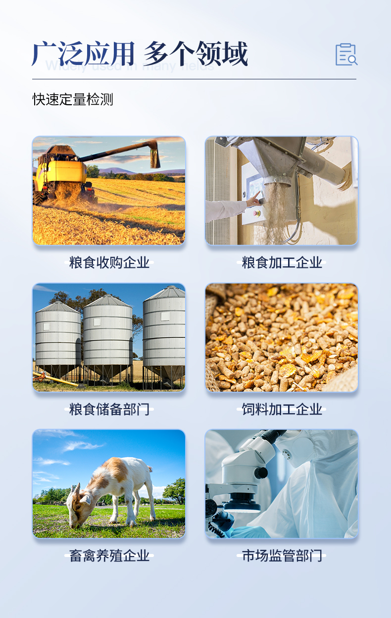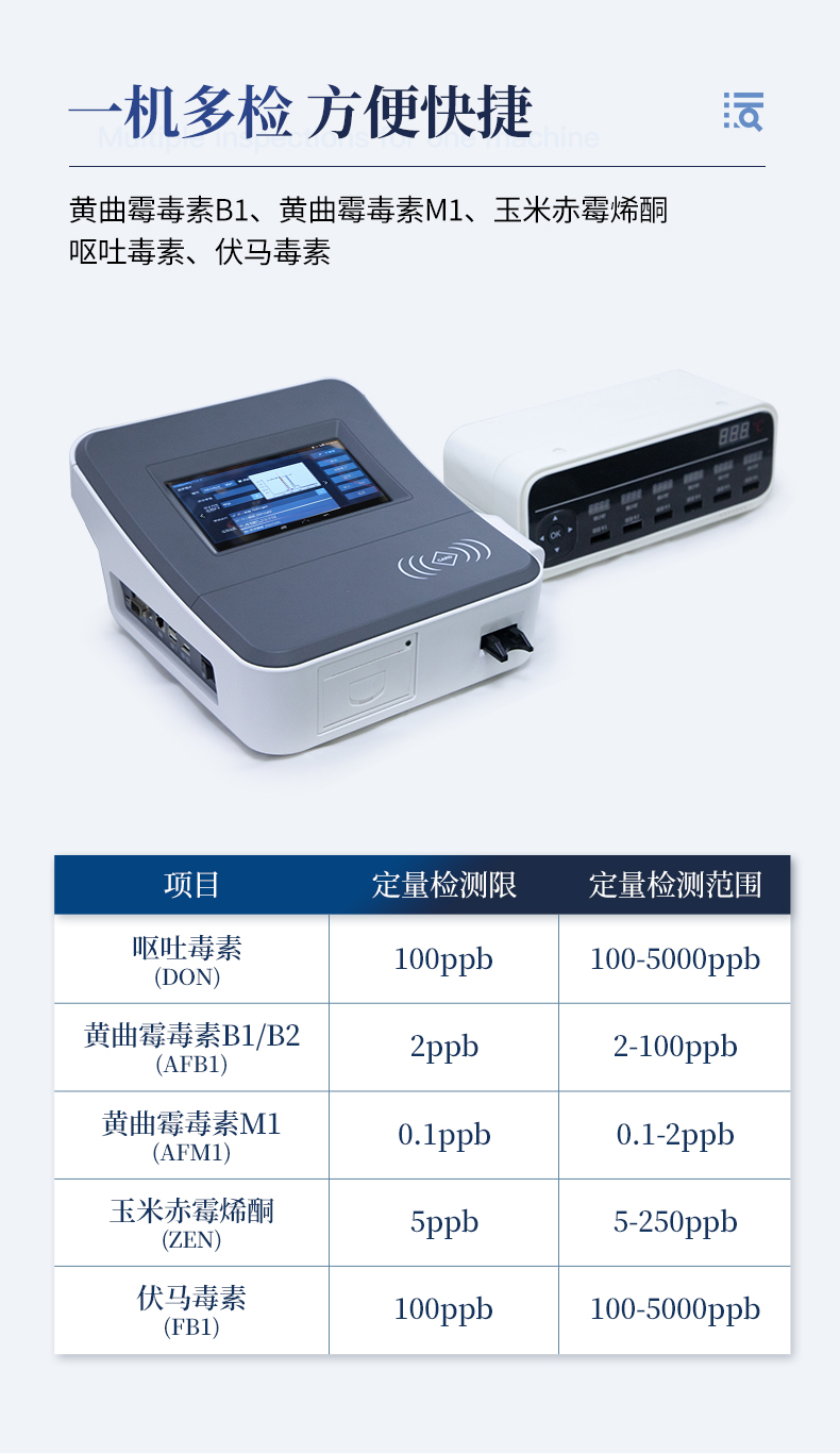 真菌毒素?zé)晒舛糠治鰞x可快速檢測糧食、飼料、谷物、食用油、調(diào)味品中如玉米、大米、小麥、大麥、糙米、麩皮、稻谷、豆粕、米糠、飼料中的黃曲霉毒素B1、黃曲霉毒素M1、玉米赤霉烯酮、嘔吐毒素、伏馬毒素,杜絕毒素污染,維護食品安全。