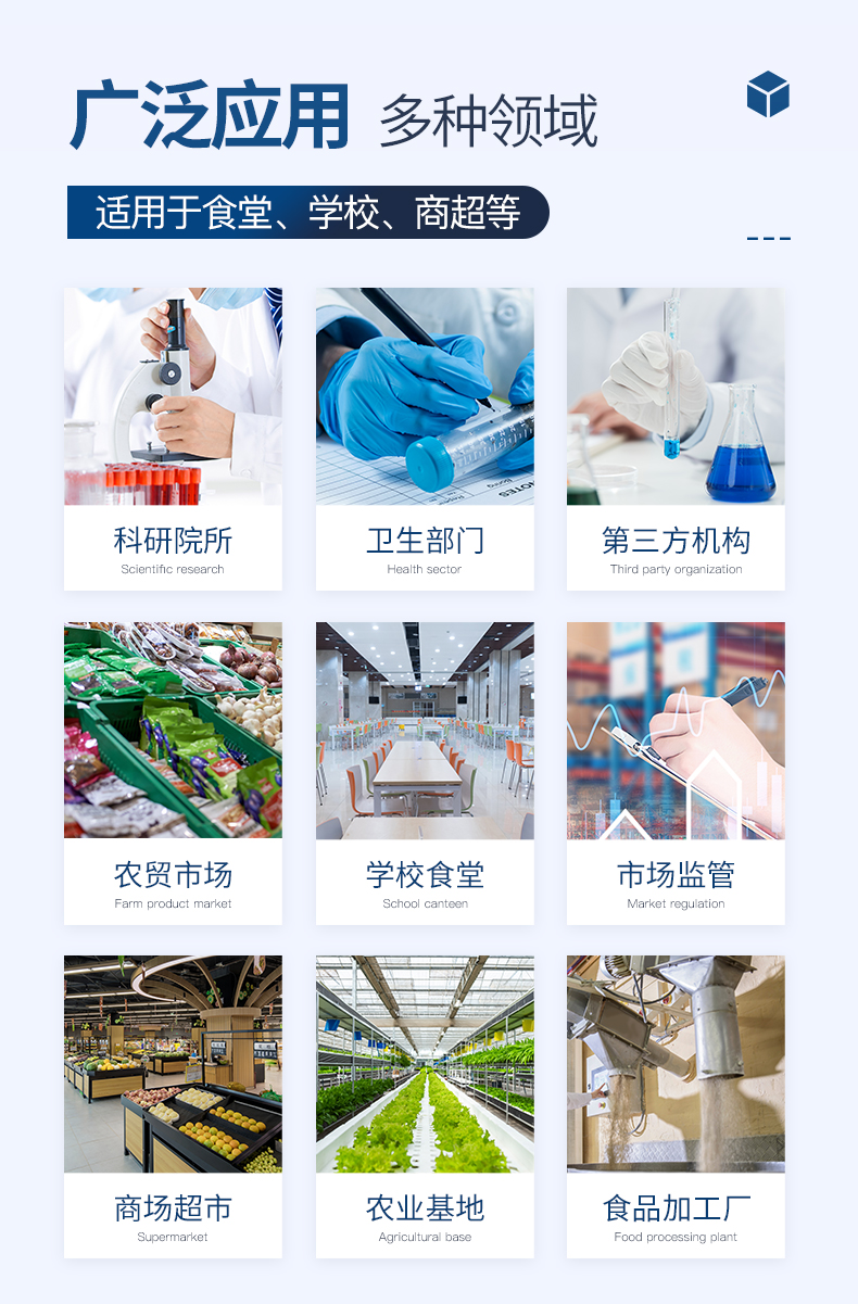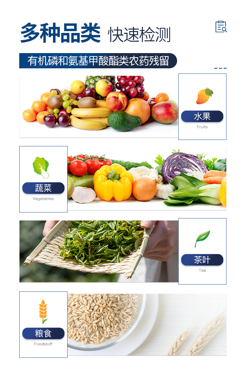 廣泛應用于主要用于蔬菜、水果、茶葉、糧食、農副產品等食品中有機磷和氨基甲酸酯類農藥殘留的快速檢測;此外還可用于果蔬茶生產基地和農貿批發銷售市場現場檢測,餐館、學校、食堂、家庭果蔬加工前的安全速測等。