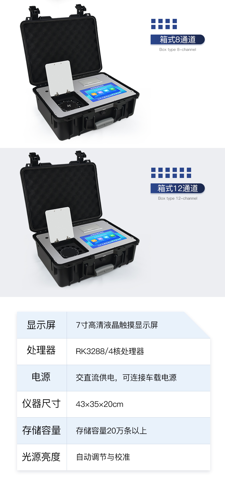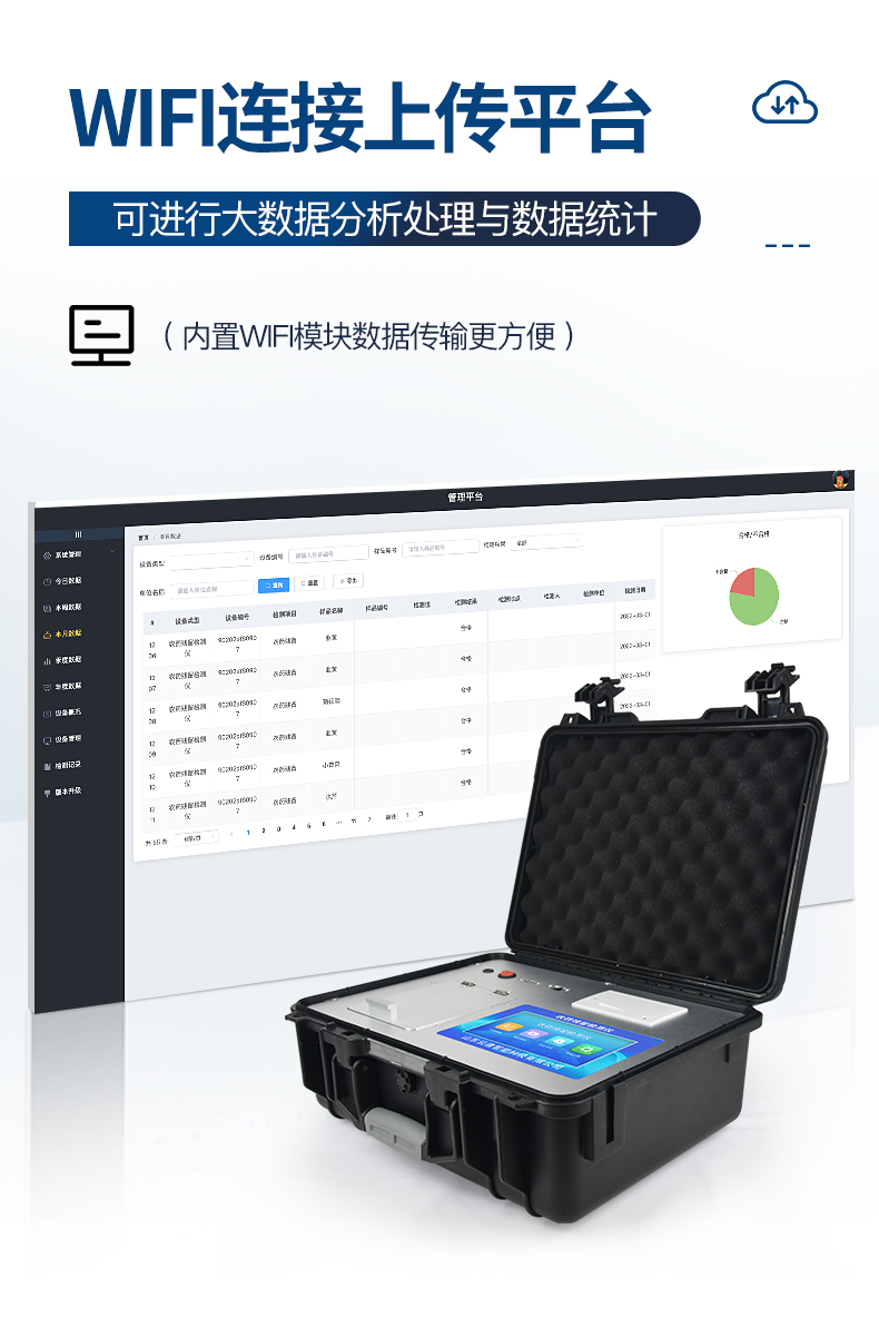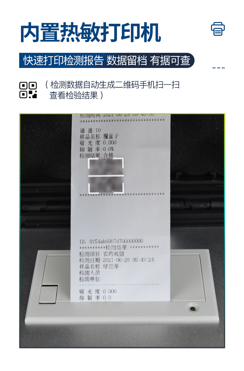 | 乙酰膽堿酯酶和丁酰膽堿酯酶試劑均可以使用,符合國家標準和農業部標準的要求。 | 自動判斷樣品是否合格,檢測結果更加直觀。 | 儀器具有100多種蔬菜名稱菜單庫,分類管理,并可按需添加或刪除蔬菜名,編輯蔬菜名稱,可直接打印出蔬菜名稱。 | 檢測通道:12個檢測通道,可以同時測試多個樣品,循環檢測,即放即檢,每個樣品由程序控制分別獨立工作,不會互相干擾。 | 智能操作系統,采用更加人性化操作,主控采用多核處理器,主頻1.88Ghz,運轉速度更快速,穩定性更強。 | 顯示方式:7英寸高靈敏真彩觸摸屏顯示,人性化中文操作界面,讀數直觀、簡單。 | 打印機采用串口5v打印,可選擇手動打印或者自動打印,三分鐘出打印結果,打印格式為檢測人姓名、吸光度差值、檢測時間、檢測機構、樣品名稱及結果判定。 | 光源采用進口超高亮發光二極管,具有低功耗、高精度、穩定性強、光源可控可以關掉不使用的光源,響應速度快等優點。 | 智能恒流穩壓,光強自動校準,長時間連續工作光源無溫漂現象。 | 儀器具有GPRS遠傳功能,可插手機卡實現數據遠傳平臺,wifi聯網功能,可將數據快速上傳電腦,進行數據管理與統計。 | 采用USB2.0接口設計,方便數據的存貯和移動,并可隨時與計算機直接相連,并且可用計算機控制儀器。實現數據查詢、瀏覽、分析、統計、打印等。 | 智能化程度高,儀器具有自檢功能:具有開機自檢和調零功能,具有自動檢測重復性功能 | 儀器具有自身保護功能,可設置用戶名及密碼,防止非工作人員操作等。 | 采用DC12v直流供電,安全系統更高,并且配備6A鋰電池充電器。 | 儀器具有重新校準、鎖定、恢復出廠設置功能。 |