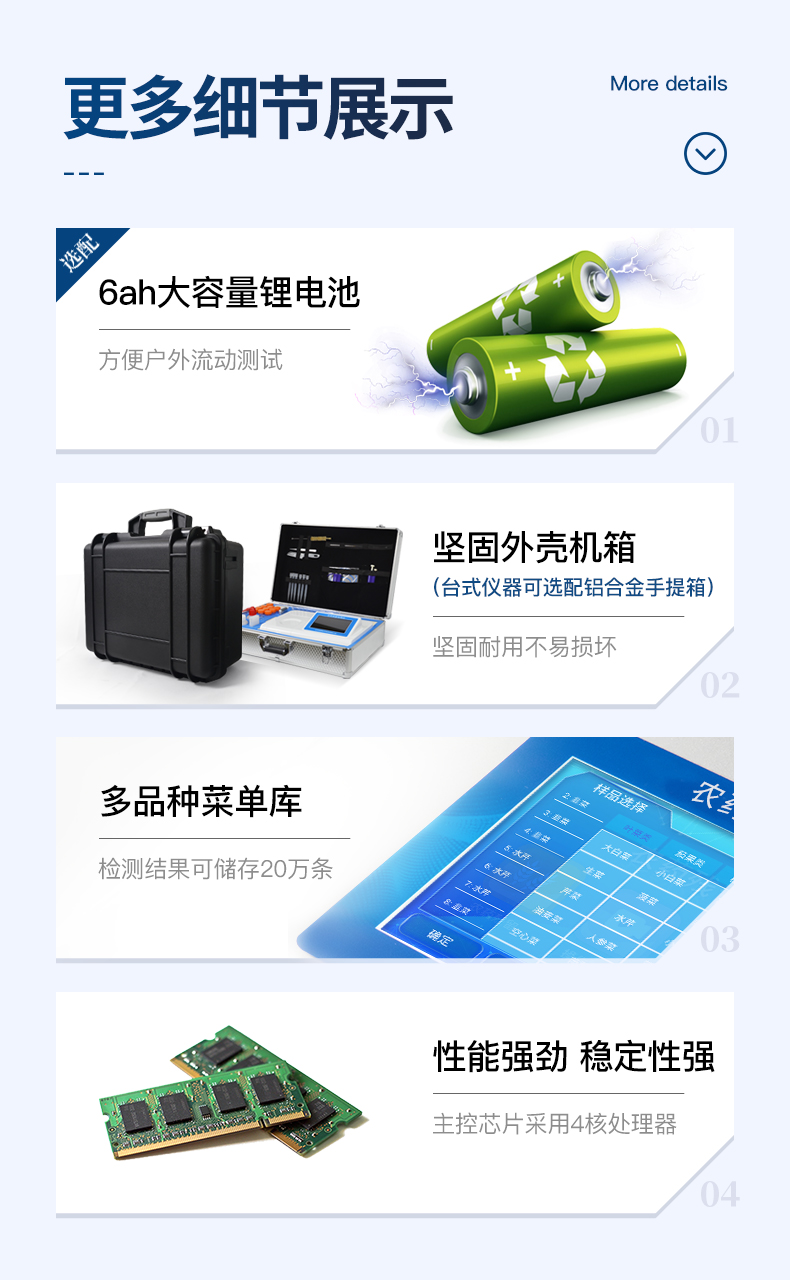 | 1)可加配語音報讀功能,人性化指導操作。 | 2)儀器可實現自身加熱功能。 | 3)可配置大容量鋰電池。 |